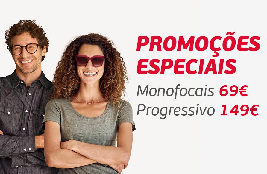 *PVP pela compra de uma armação à escolha entre um sortido identificado na loja e de duas lentes orgânicas monofocais endurecidas com anti-reflexo (-6 a +6 D e astigmatismo até 2D), ou de duas lentes orgânicas monofocais verdes, cinzentas ou castanhas (-5 a +5 D e astigmatismo até 2D). Não acumulável com outras promoções.